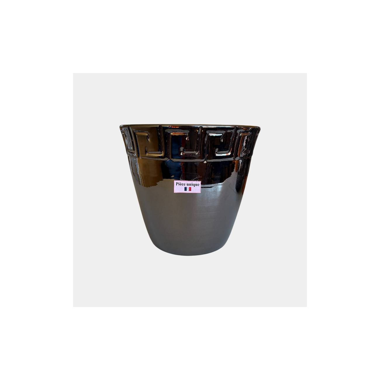 Cette poterie métal capte la lumière et fait ressortir chaque détail de son design travaillé géométrique.